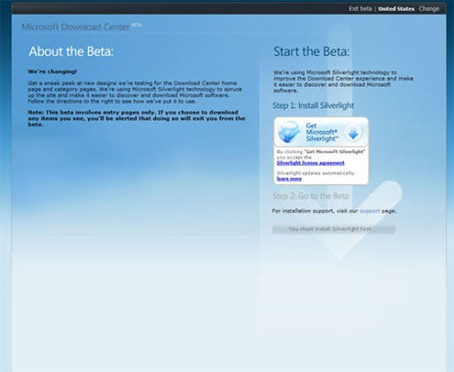 SilverLight is touted as Microsoft's replacement for Flash, but still requires a lot of effort on Microsoft's part to make it cross-platform. Its speciality is video and animation and that is very well showcased on the new download center. The top banner on the page shows some nice animations and so does the search and menus for downloads. You can look below for the screenshot or experience after you get into the beta!!