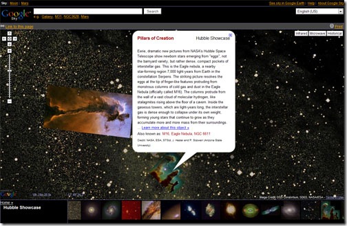 Just like Google Earth and Maps, Google Sky's interface is the same zoom, move around. But Google Sky has got Infrared, Microwave, and Historical viewing options. Nice to look through those different views. Other things include images from Hubble, Chandra, Galex, Spitzer. Really nice images if you like astronomy and sky watching like me. Google Sky can also be used as an educational tool by school professors to explain the Solar system, which is shown through another section of Google Sky.